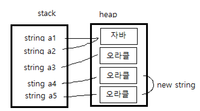 String a4 = new String ("오라클"); // heap에 새로운 개체가 생김